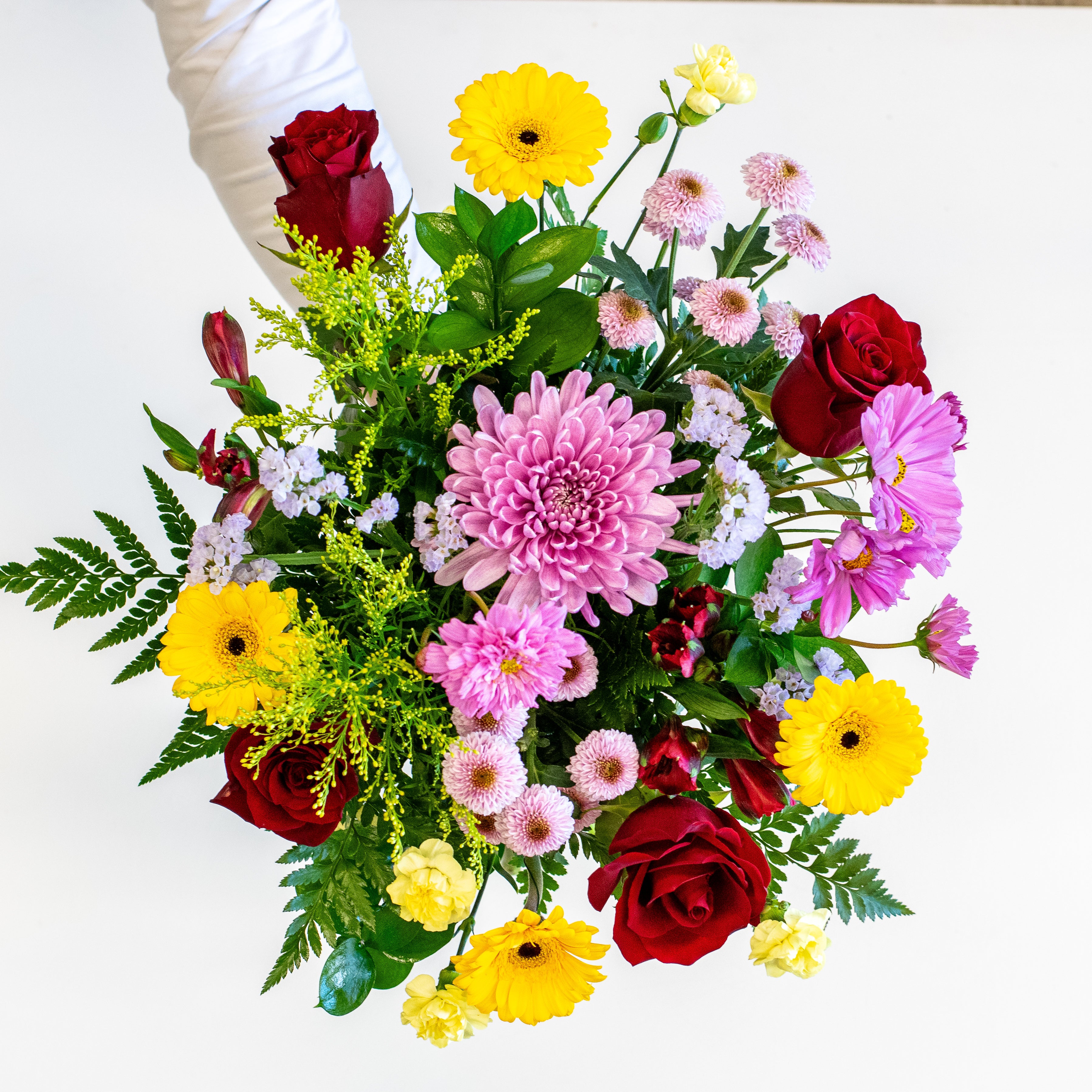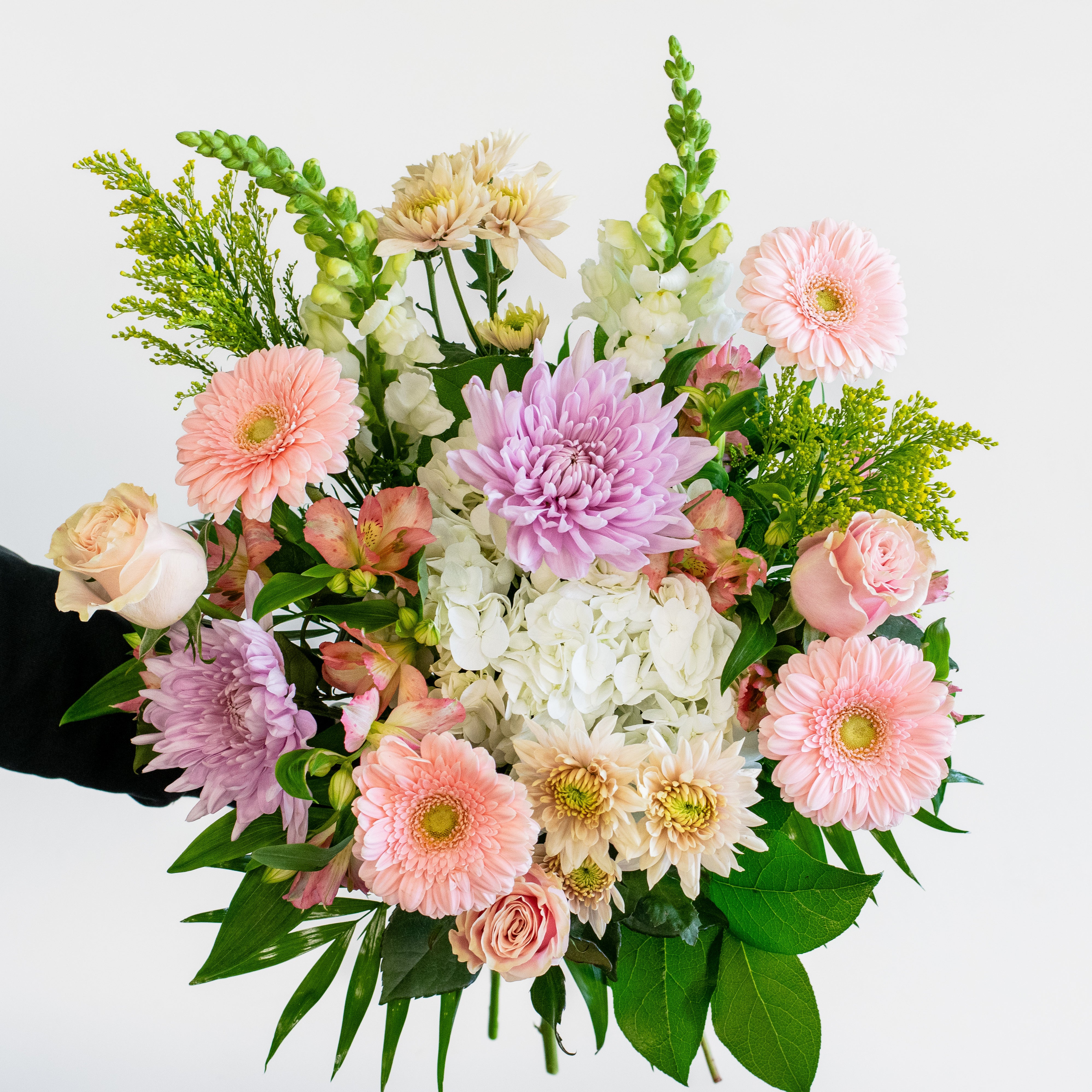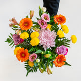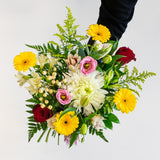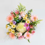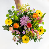Our stunning hand-tie arrangement features at least six different flower types, making it an ideal gift for flower enthusiasts who enjoy diversity. Each arrangement is uniquely crafted for you using the freshest seasonal blooms, tailored to your preferences. If you have specific flowers or colours you'd like us to incorporate or exclude, please specify in the "Special Instructions" section when viewing your cart.